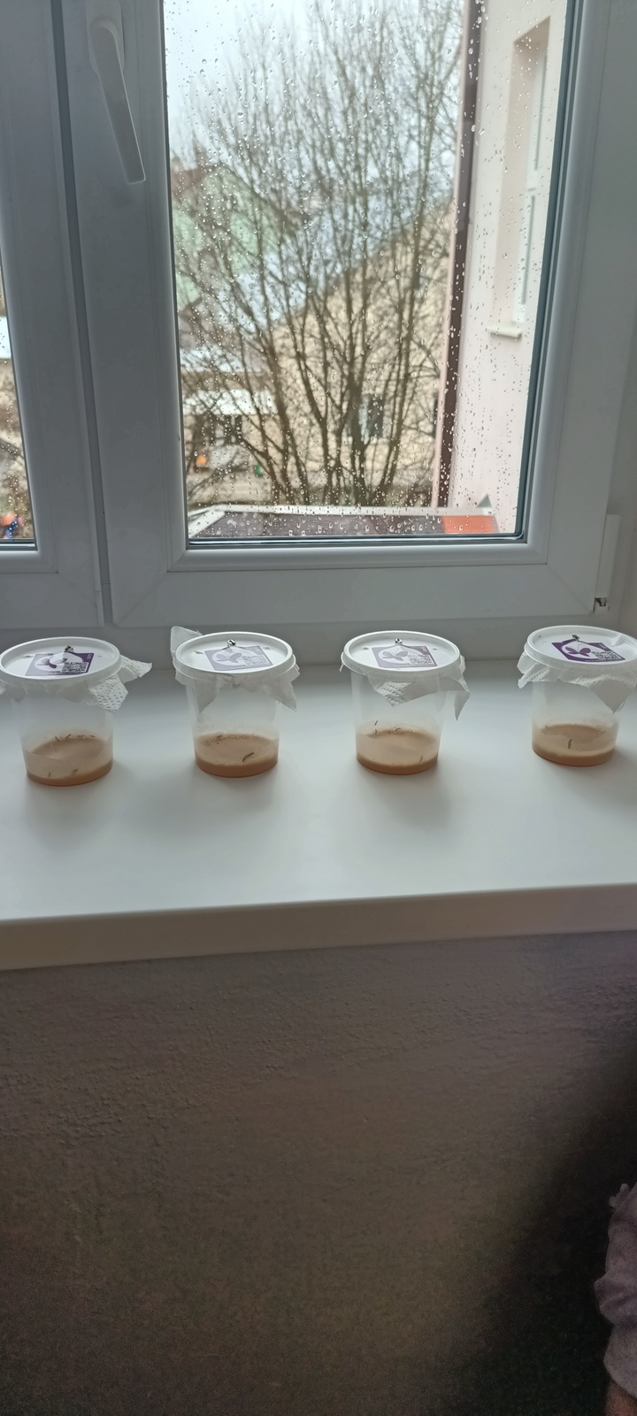 Na chodbě ZŠ Brněnec 28 se nachází čtyři kelímky housenek motýla bělohlavého s potravou.