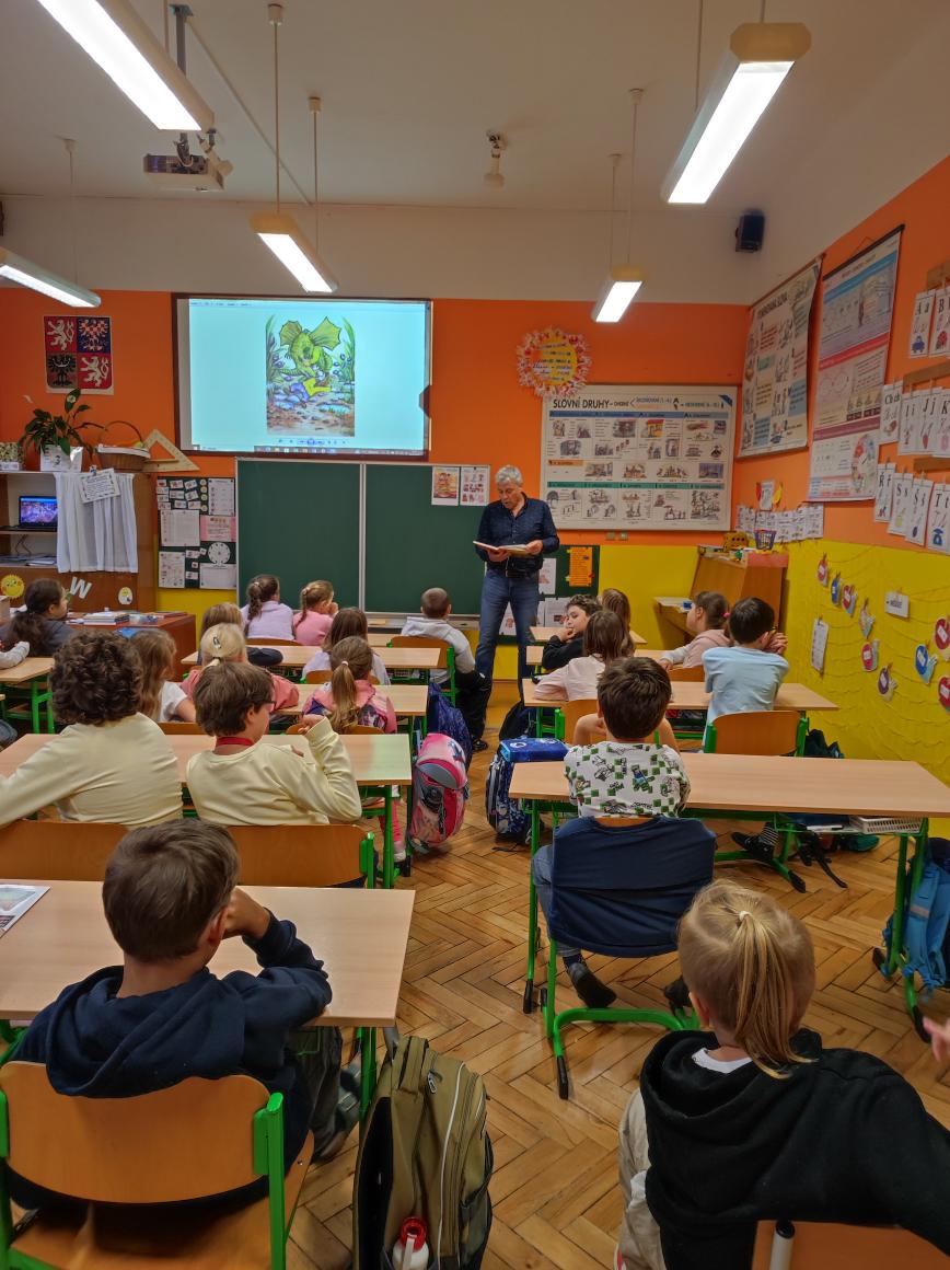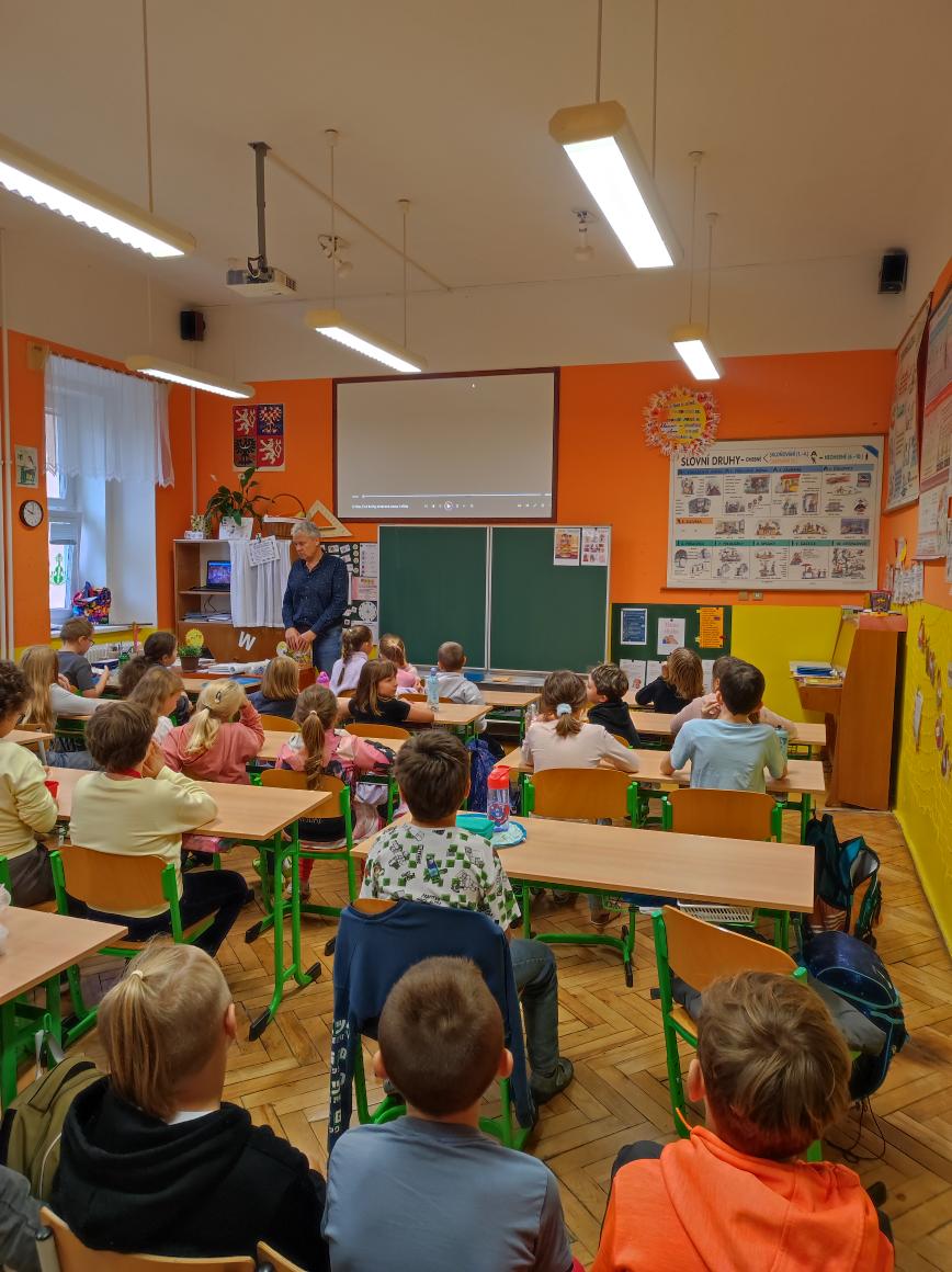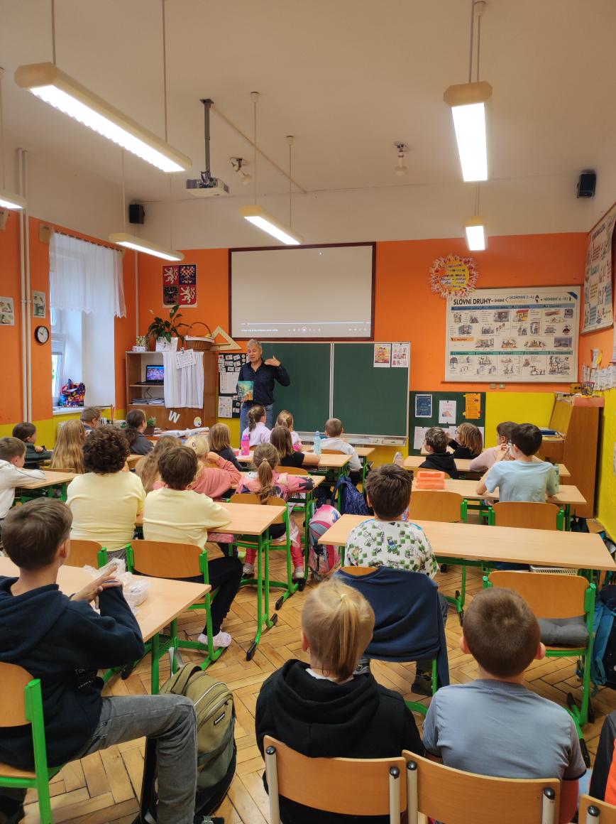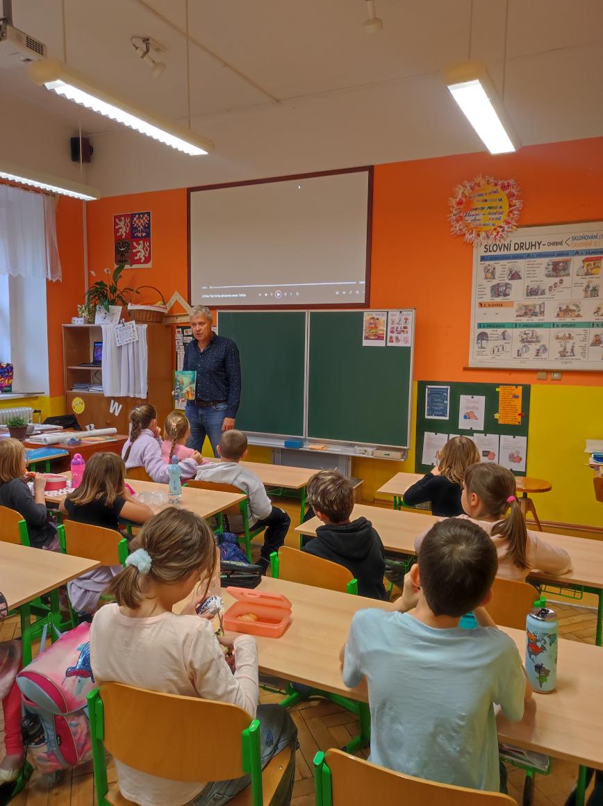 V pátek 26. září 2025 se v naší škole uskutečnila pro žáky 1. stupně beseda s autorským čtením se spisovatelem Josefem Benešem – autorem dětské knihy Meďan a Koumen na zatopené planetě.