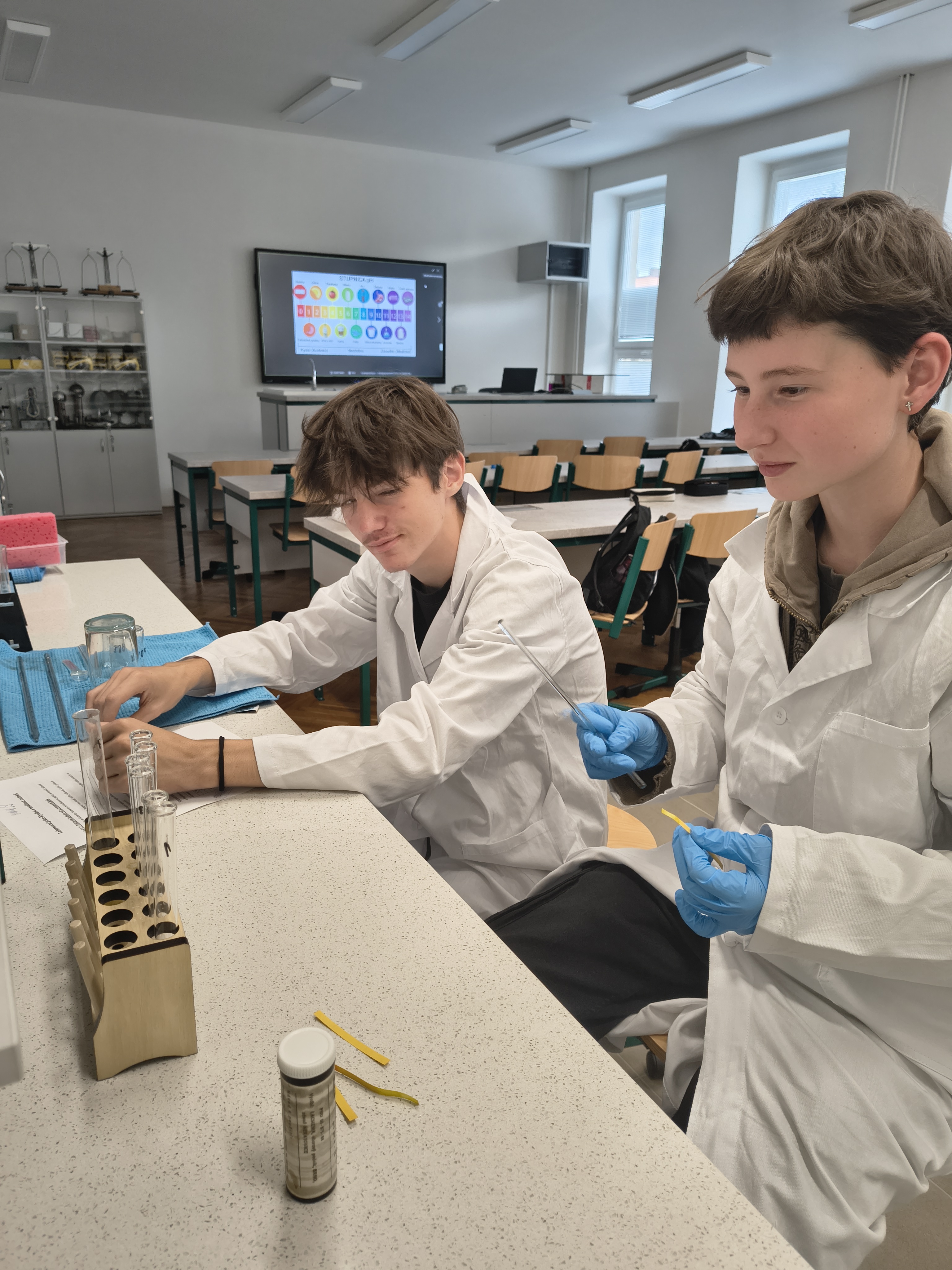 Žáci 9. třídy se v uplynulých hodinách chemie věnovali učivu o kyselosti a zásaditosti látek a jejich praktickému měření, v praxi známé jako měření pH.